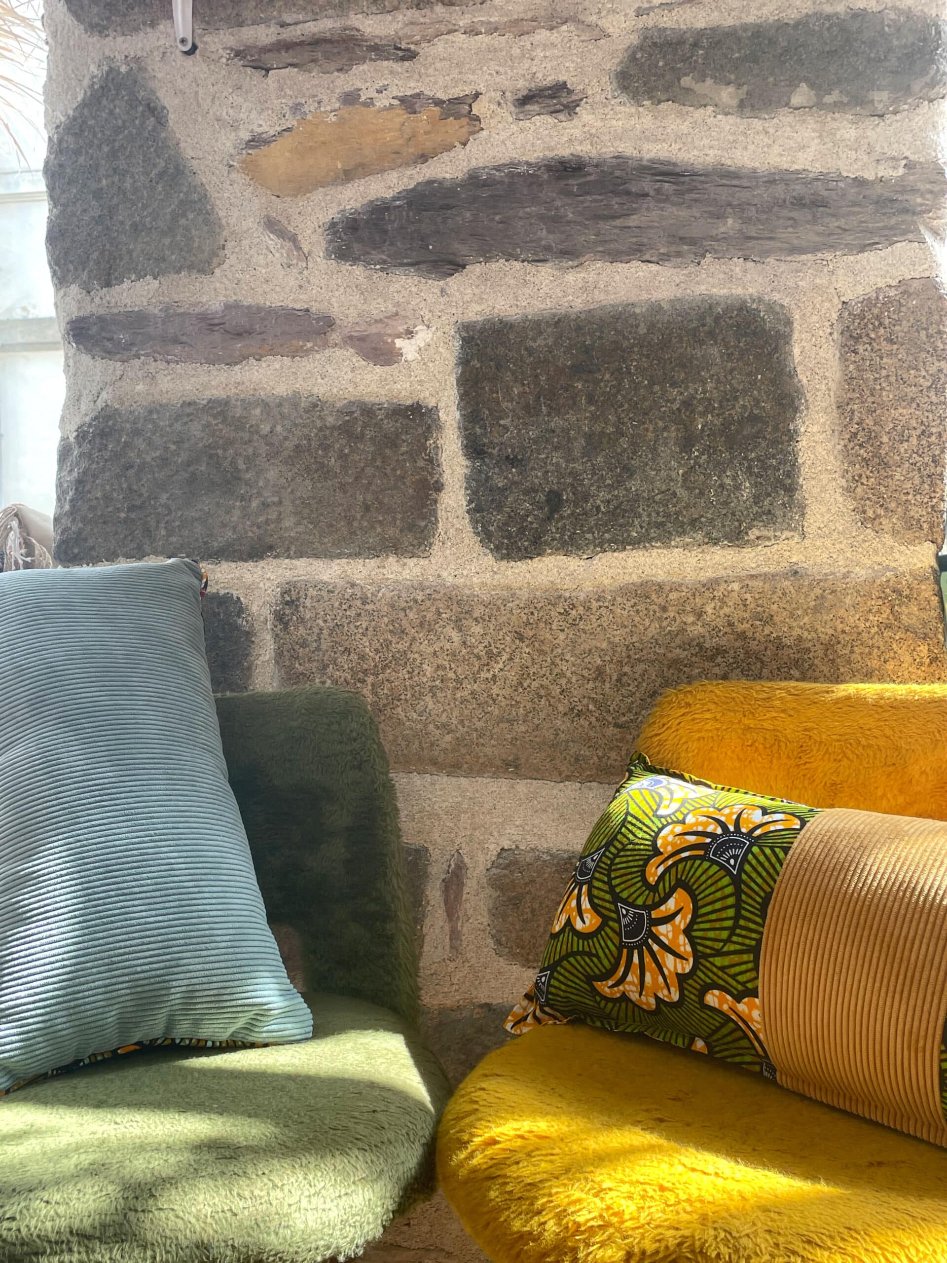 Coussin en Velours et Wax, tonalités beige, jaune et vert. Vendu avec la garniture, 30*50cm